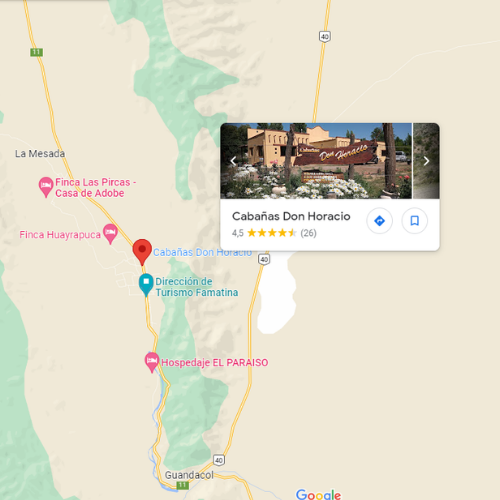 A sólo unas cuadras de la plaza principal, sobre la ruta, se alza Cabañas Don Horacio.